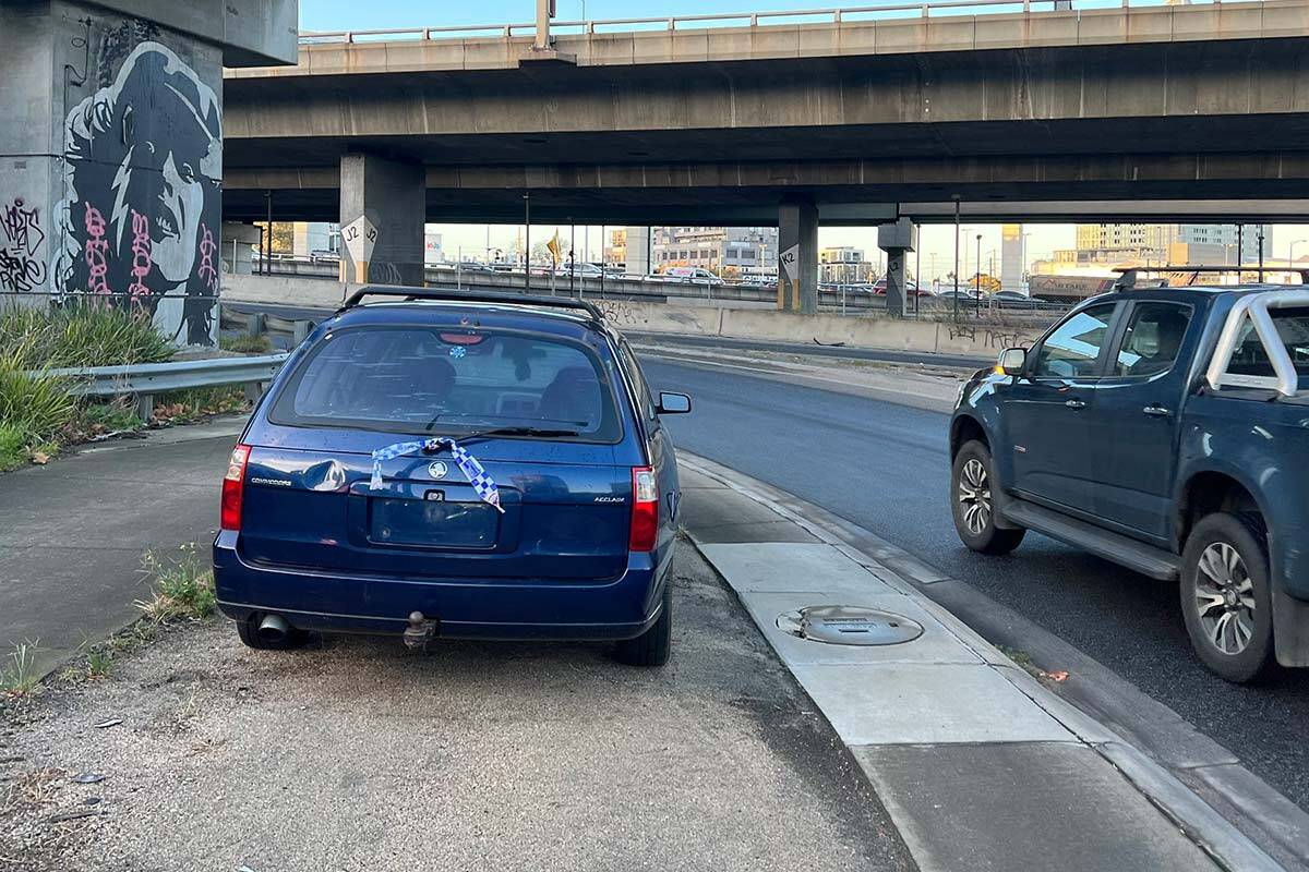 One dumped car — with a police ribbon on it — has been dumped beside the entrance to the Westgate Freeway in Southwharf for several days.