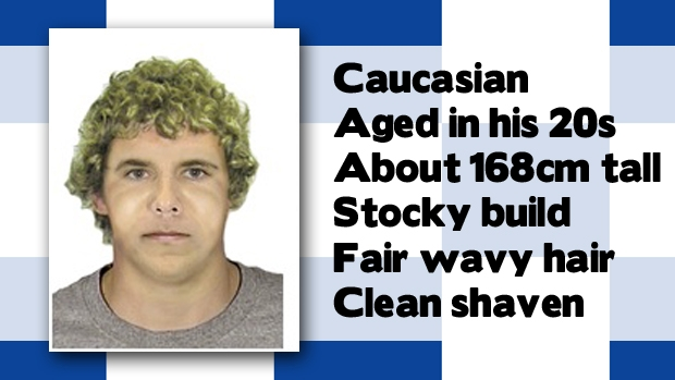 He is described as Caucasian in appearance, aged in his 20s, about 168cm tall with a stocky build, fair wavy hair and clean shaven.