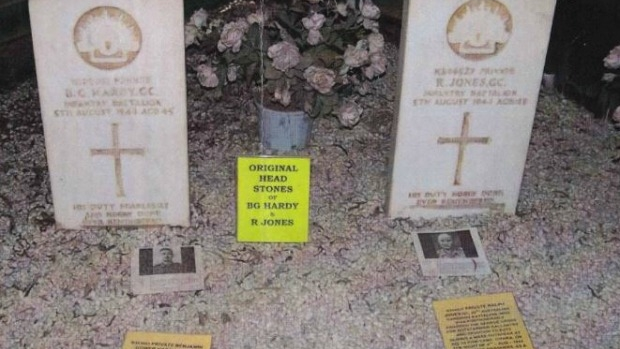 A war memorial staff member went undercover at the sale to buy back the tombstones of George Cross recipients Benjamin Hardy and Ralph Jones.
