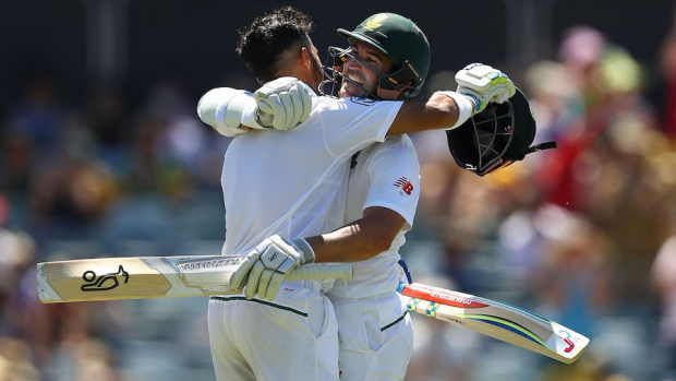 It’s lunch on a very hot morning at the WACA, an excellent session for Elgar (69) and Duminy (74) sees South Africa 2/183.