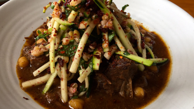 A beef tagine comes courtesy of the Fresians from the dairy farm too. The meat is braised down with a chermoula spice mix and preserved lemon pulp. Chickpeas are added, julienned preserved lemon, Mt Zero freekah, and zucchini, mint and coriander from the garden. This is complemented by a Sebago potato salad with speck and lentils.