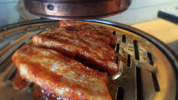 For the Korean sweet spicy pork belly and corn the cooking plate is changed, this stuff is pretty messy, but of course it’s tasty. Again, just a small slice of corn on the cob each, but it’s lovely and sweet.