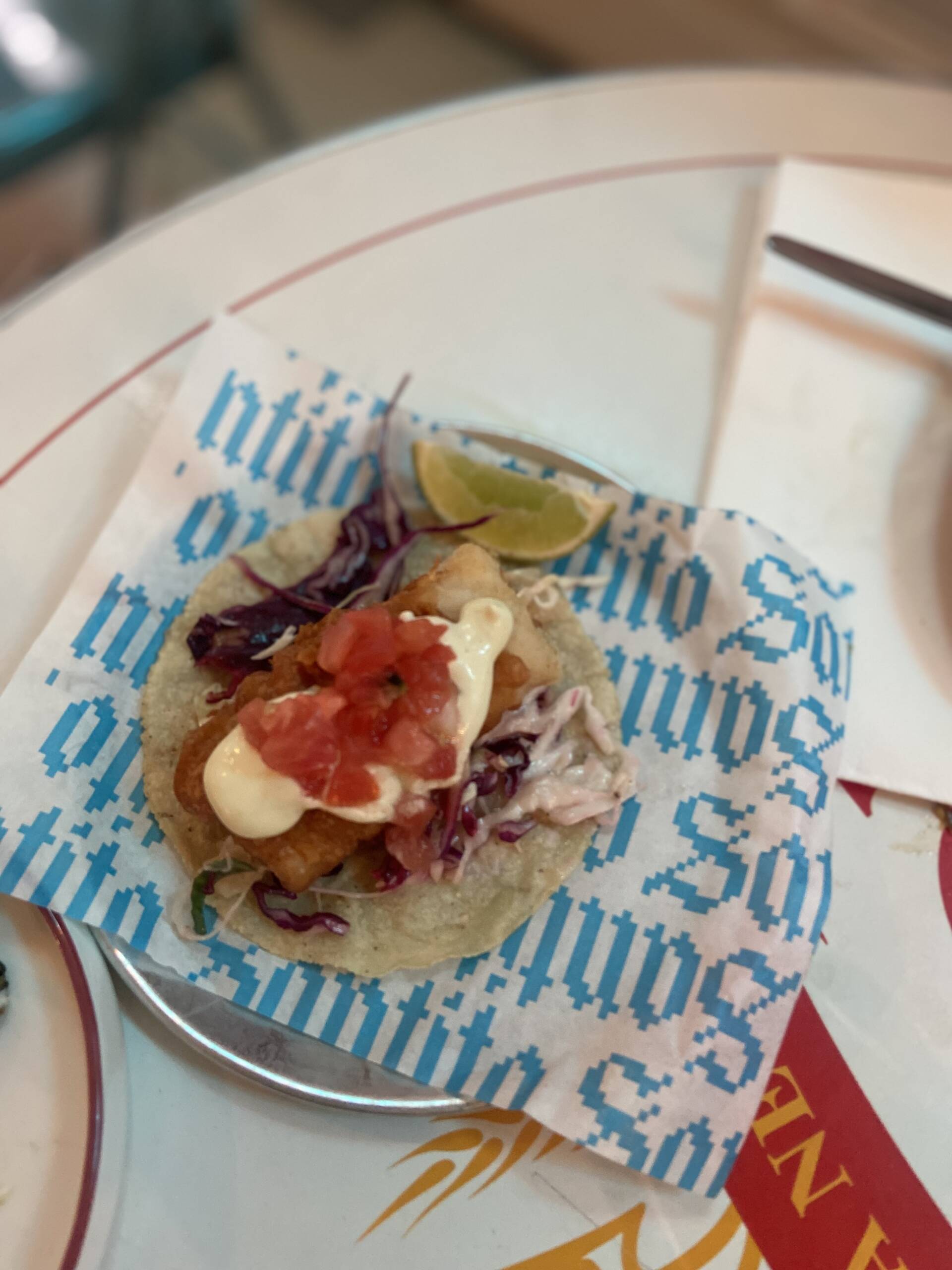 This one comes with soy and orange-cured tuna on top, with lime and jalapeno mayo, avocado and pickled jalapeno. It sits somewhere between ceviche and sashimi, but the citrus and chilli keep it firmly in Mexican territory. Crunchy base, cool, fresh topping, lots of brightness.