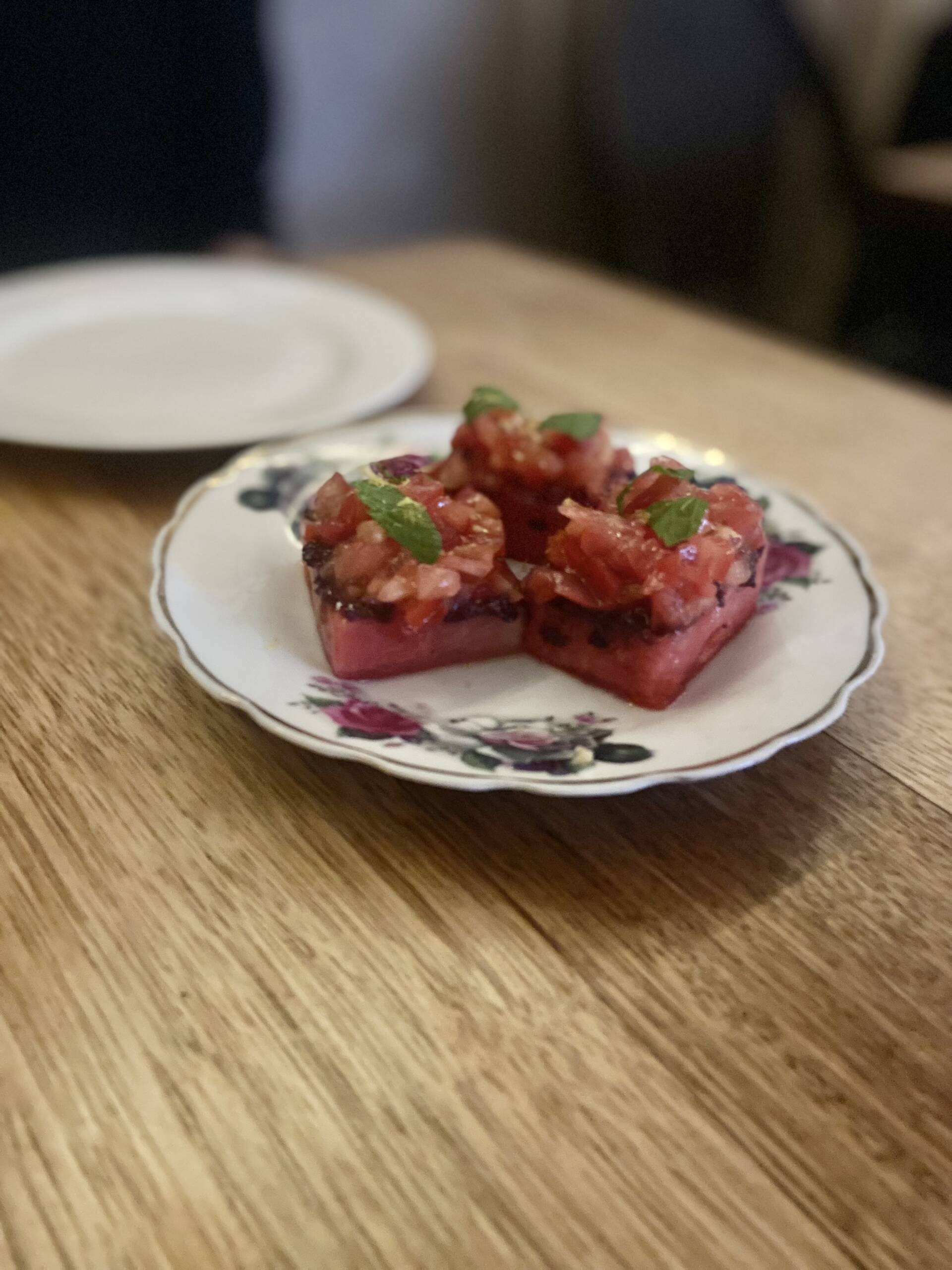 Now, the food. The first dish that hit the table was what they call the “watermelon bruschetta.” I’ll admit, I wasn’t sure about it until I took the first bite. It’s essentially a slice of juicy watermelon layered with olive tapenade, sliced tomato and fresh basil. Somehow it all comes together. You get salty, sweet and fragrant all at once. It’s weird on paper, but it absolutely works.