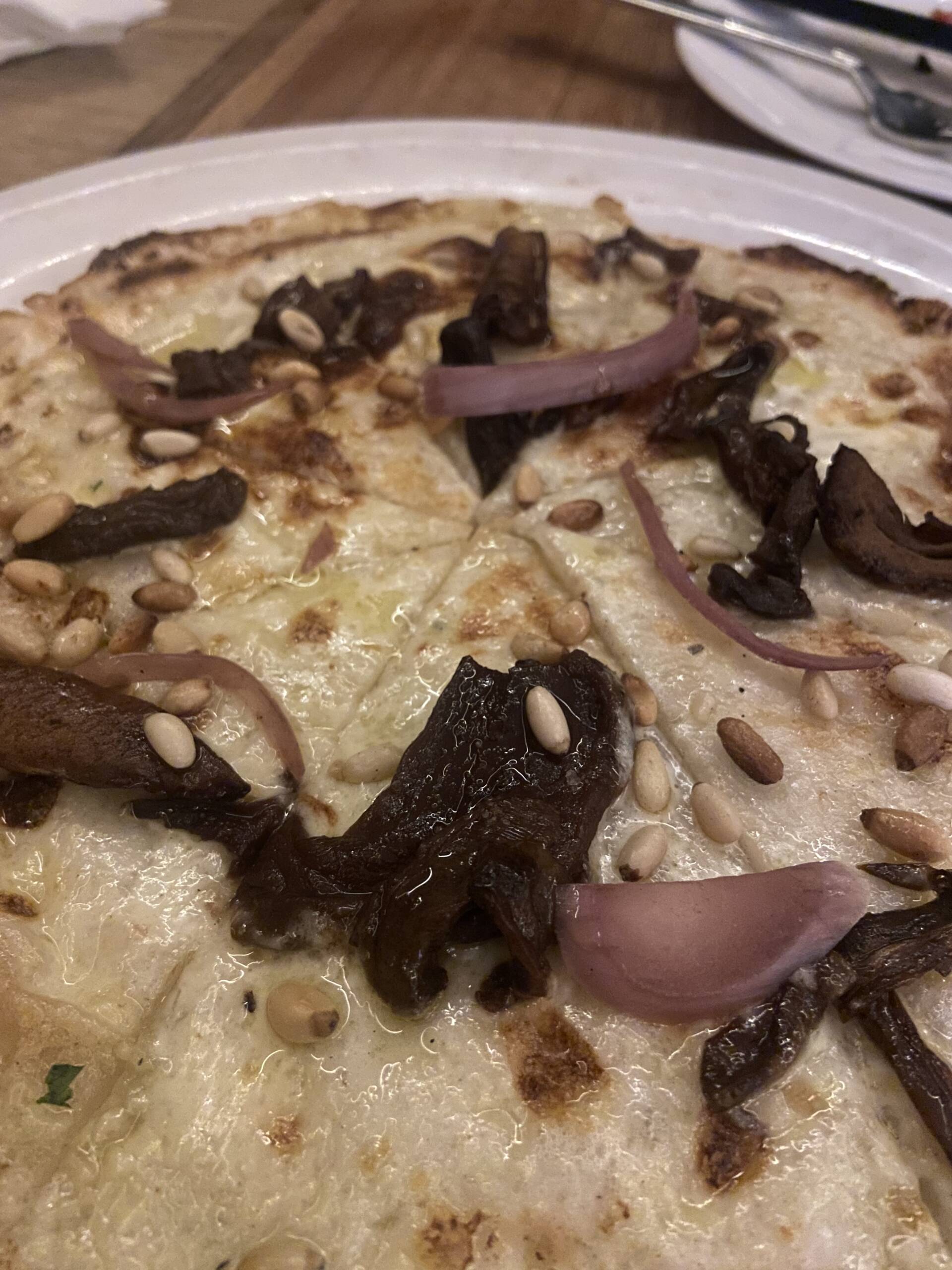 on the other end of the spectrum, there’s the mushroom pizza. That one’s more of a slow burn, all earthy and cheesy with pine nuts and a creamy white base. It’s one of those quiet achievers that sneaks up on you as the favourite.