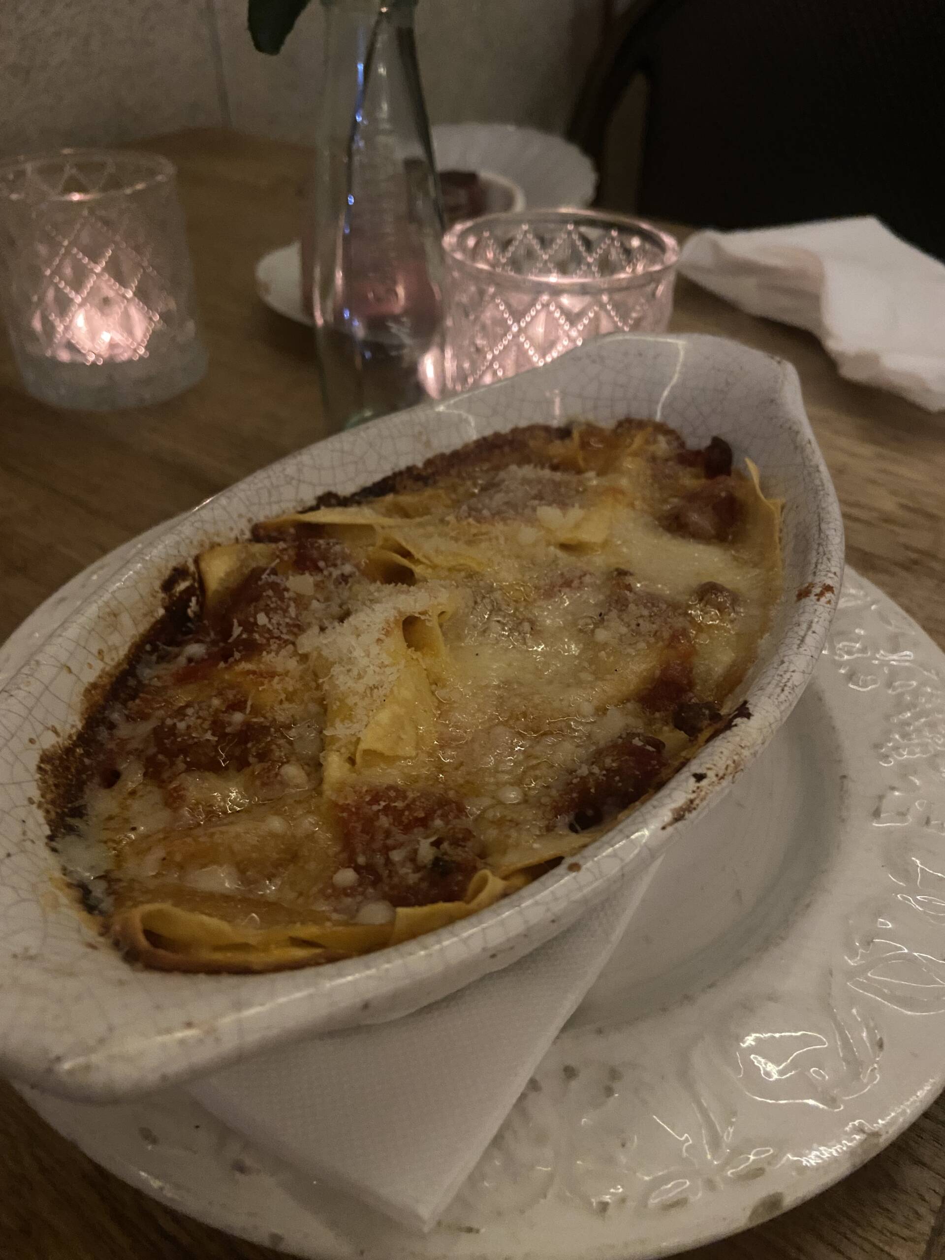 The standout for me, though, was the pasta. They do a dish called fregnacce. Now this one’s worth explaining because it’s not something you see often. Fregnacce is a type of pasta from the Abruzzo region in Italy, where the chef’s family is from. It’s made with sheets of pasta that are folded and baked with a beef and tomato ragù, then finished with grated Grana Padano cheese. The name actually translates loosely to “a mistake” or “a mess,” because it’s basically what happens when you fold pasta unevenly and bake it. But it works beautifully. The result is this rustic, bubbling dish with crispy edges on top and soft, saucy folds underneath. It’s the kind of comfort food that makes you go quiet halfway through because you’re too busy enjoying it.