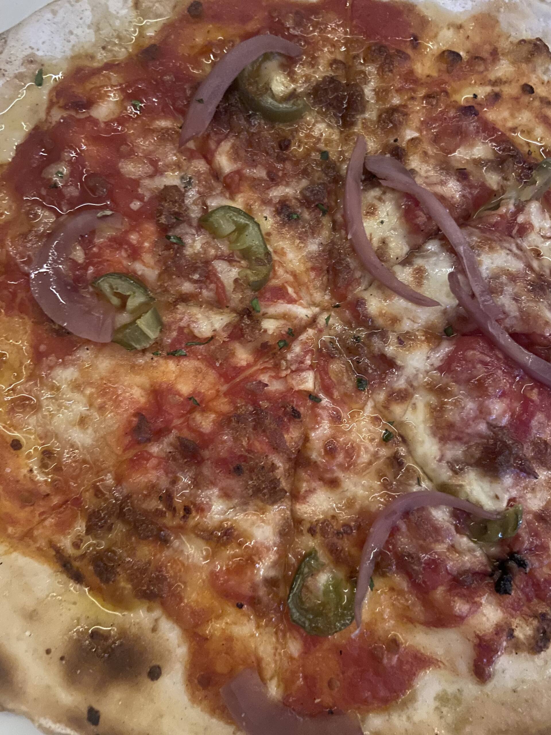 And then the pizzas arrived. The Spicy Boi got a big reaction at our table, and yes, that’s actually what it’s called on the menu. It’s topped with nduja, a spicy Calabrian sausage spread, along with pickled onions, jalapeno and scarmorza cheese, which melts in that smoky way you only get from a wood oven. It’s got a bit of a kick, but it’s not overpowering. Then,