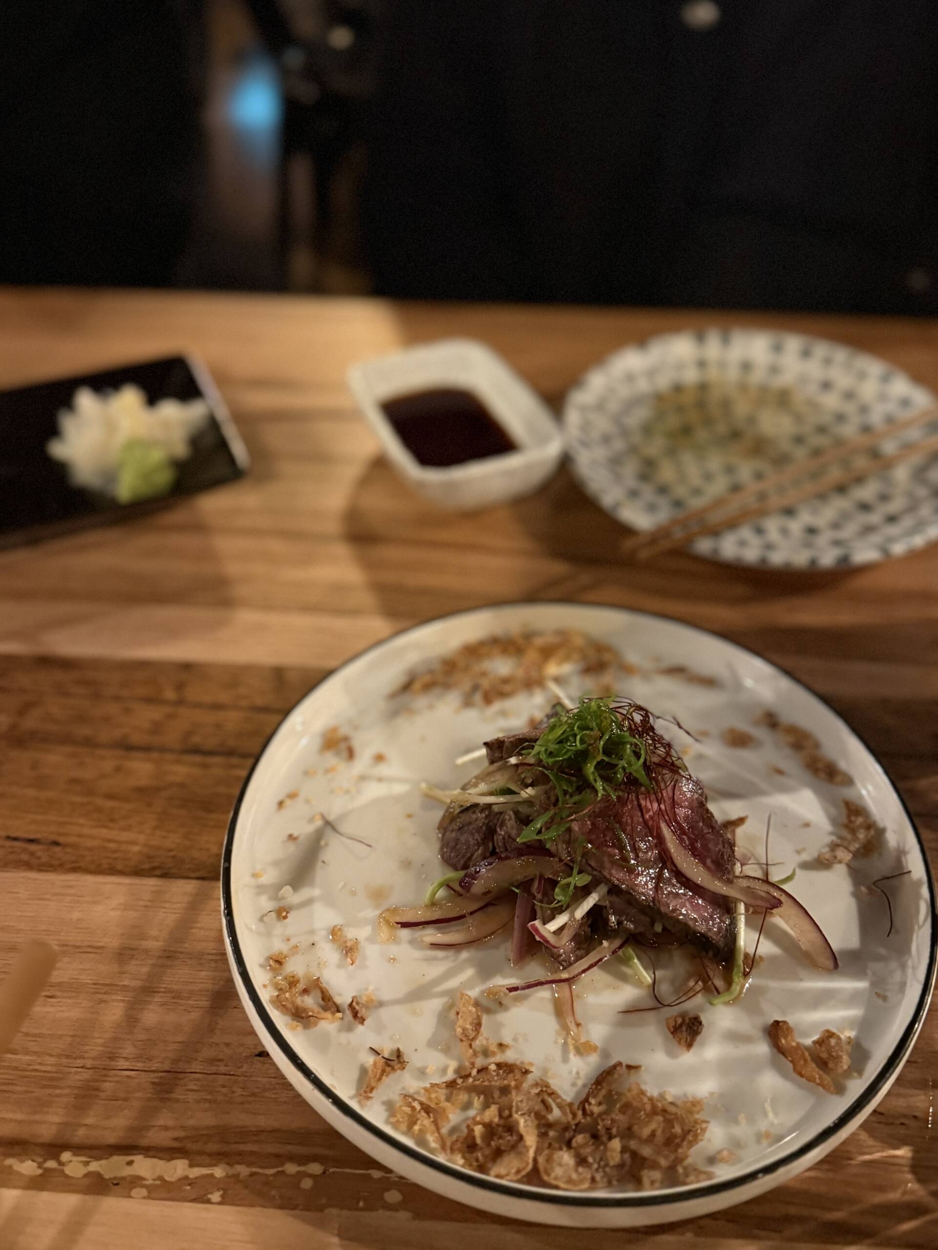 We started with a couple of small plates. The Hosomaki offered up thin sushi rolls filled with everything from cucumber and avocado to tuna mayo and salmon, with both vegan and gluten-free options available. Simple, clean flavors that were just the right size for a starter. The Wagyu Tataki (seared rare wagyu with yuzu kosho ponzu and daikon oroshi dressing) was a standout- perfectly seared and tender, with the citrusy yuzu elevating the richness of the beef.