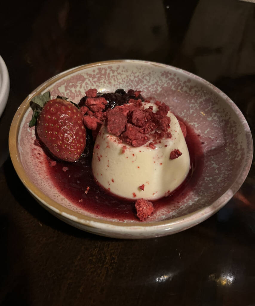 To finish, we had the vanilla panna cotta with berry compote, strawberries and freeze-dried raspberries and the dark chocolate ganache tart with pistachio praline and lime chantilly cream. Both rounded off the meal perfectly.