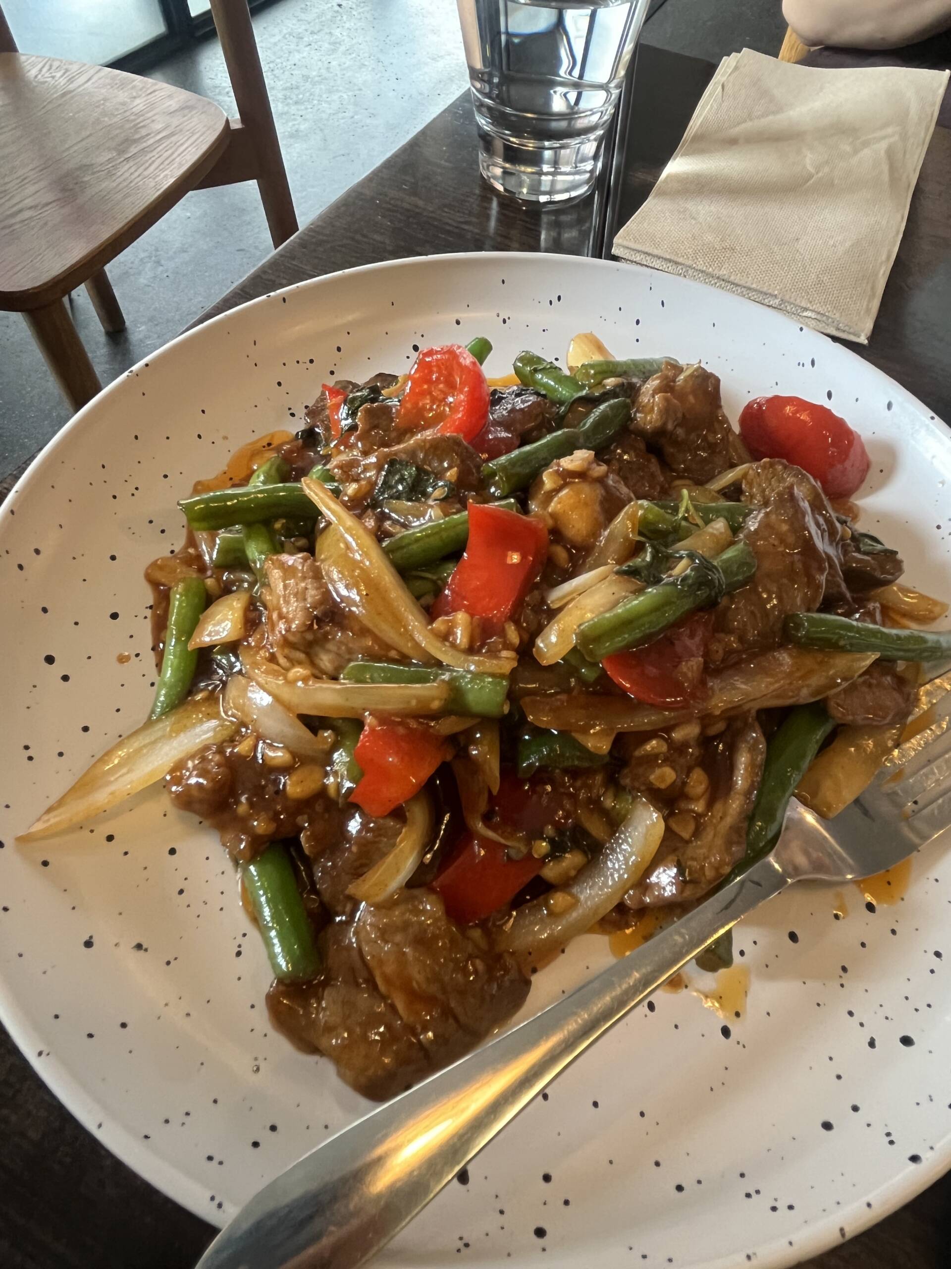 Thinly sliced beef tossed with onion, capsicum and fresh basil in a glossy sauce that carries proper chilli heat without overpowering everything else.