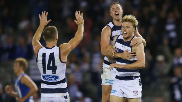Geelong leads by three points at the main break.
