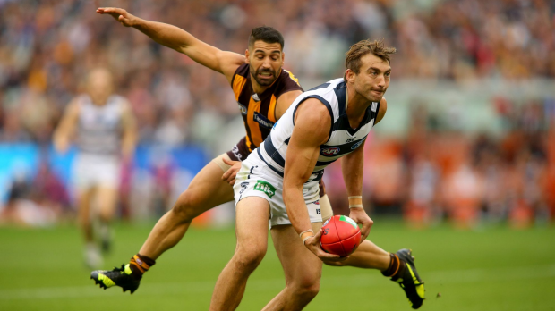 Geelong captain Joel Selwood has 17 disposals and his rival captain Travis Boak has 16.
