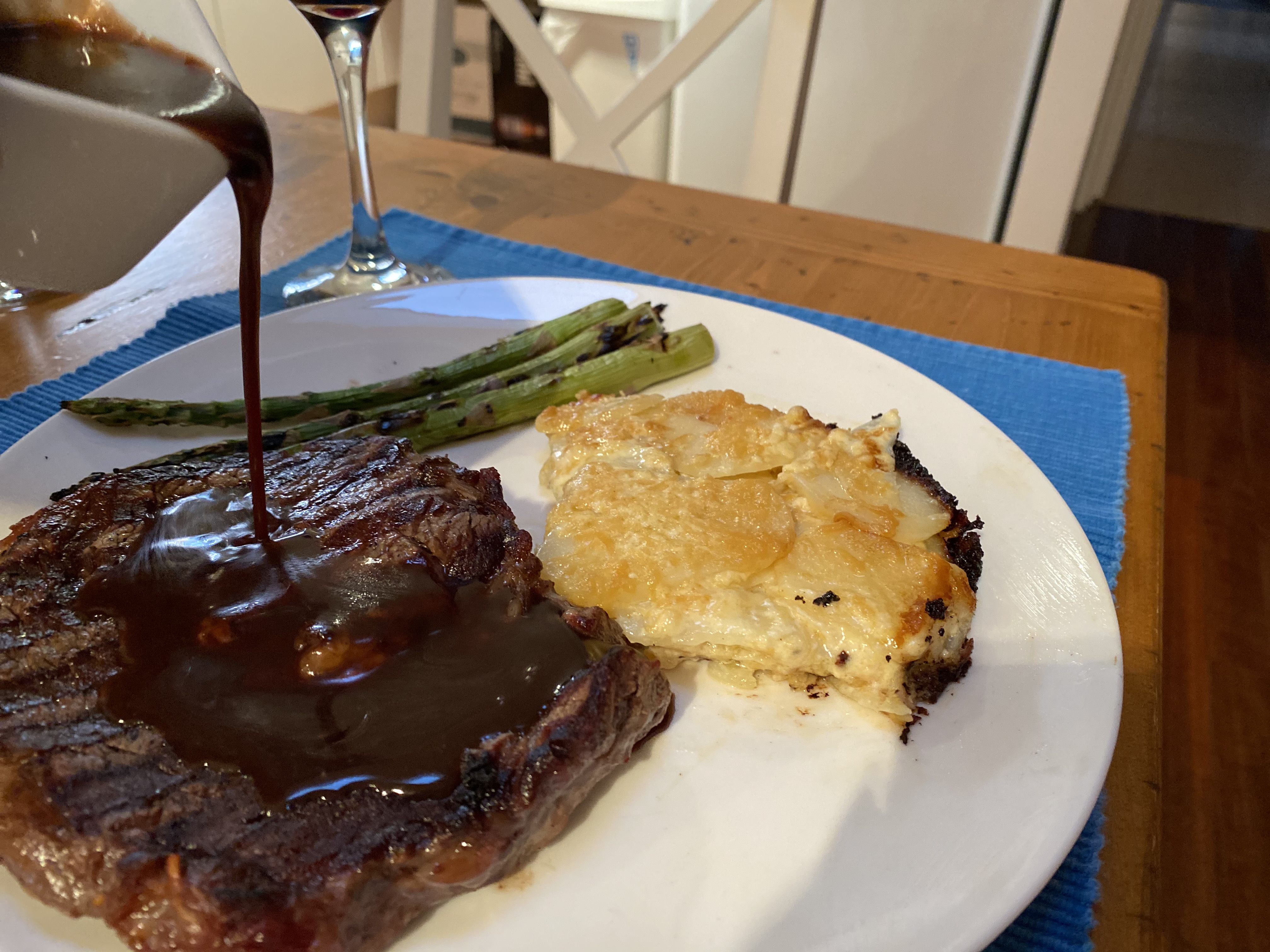 Geoff Maddern’s Scotch Fillet with Red Wine Jus, Potatoes Au Gratin and Grilled Asparagus