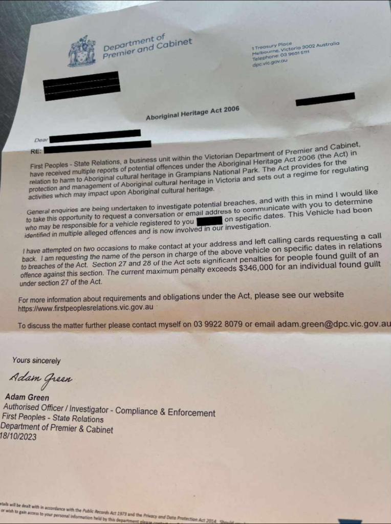 The letter from the Department of Premier and Cabinet says the person’s vehicle has been identified in “multiple alleged offences” under the Aboriginal Heritage Act.