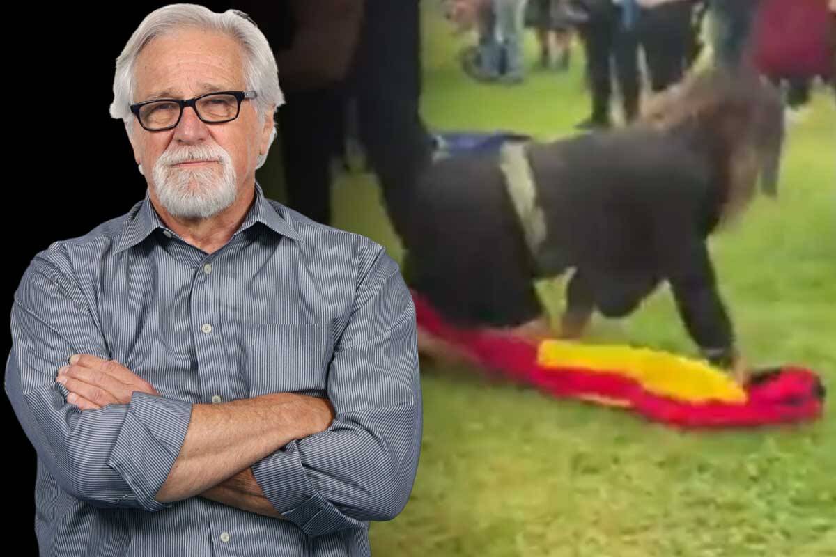 The Senator was pictured on camera crawling on the ground clutching an Aboriginal flag.
