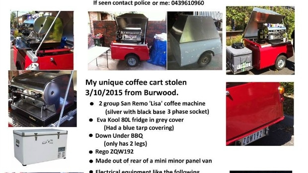 David Robinson has told 3AW Breakfast he spent about a year fashioning a mobile coffee machine from the back of a Mini Minor panel van, but it was stolen on Grand Final eve.