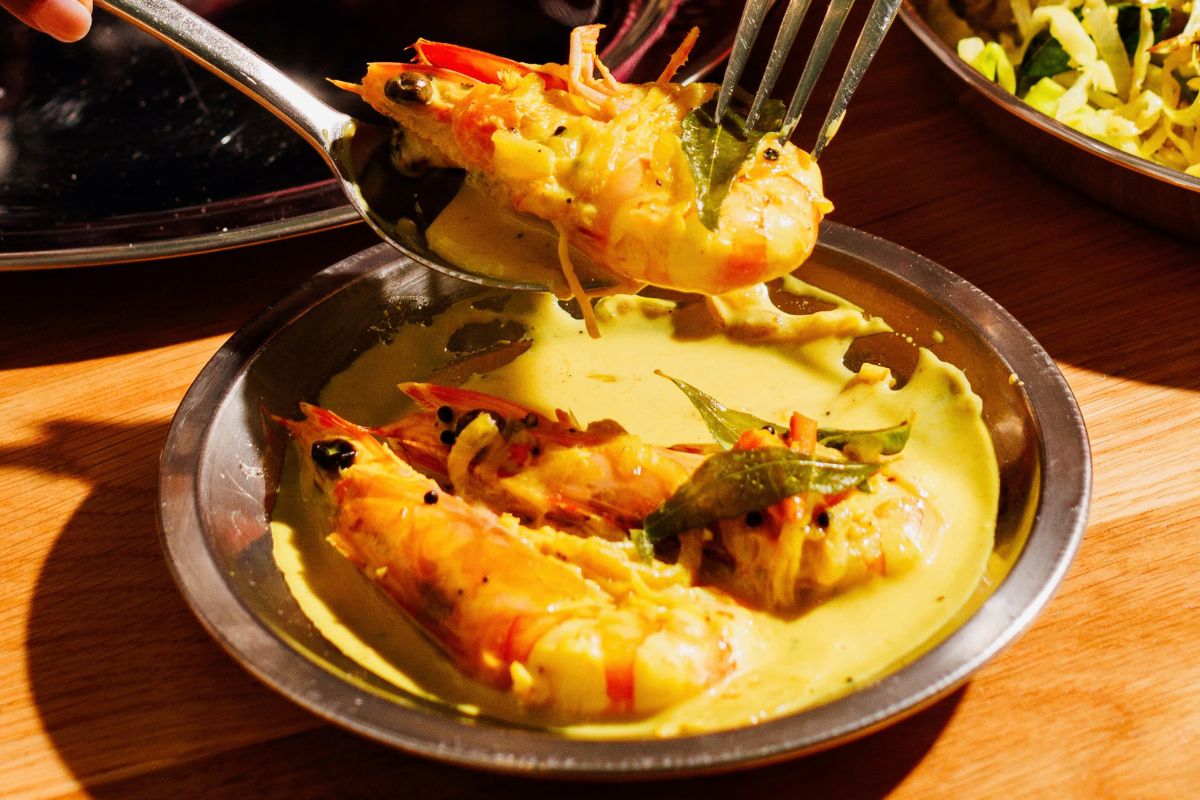 Prawn moilee, a milder turmeric-based curry sweet with coconut and tomatoes, is recommended for those with reserved palates.