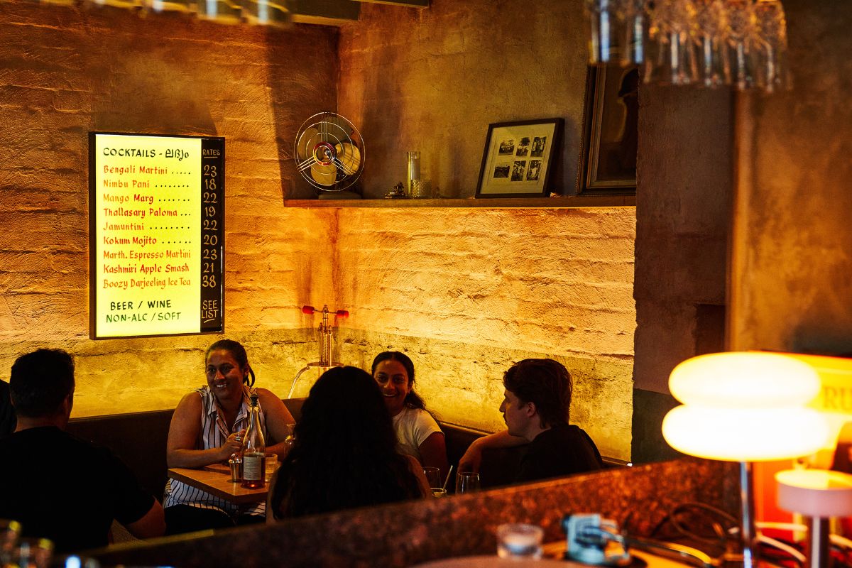 It’s an elbow’s in affair, cosy and at times rowdy, a ceiling fan whirring on overdrive keeping the brow sweating at bay, with Indian disco hits over the sound system and cold Kingfishers at the ready.