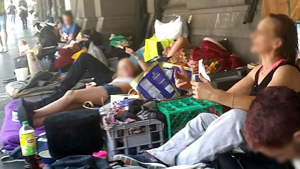 Almost 14 rough sleepers were forced to move their belongings to the other side of the footpath while a street sweeper cleaned the site.