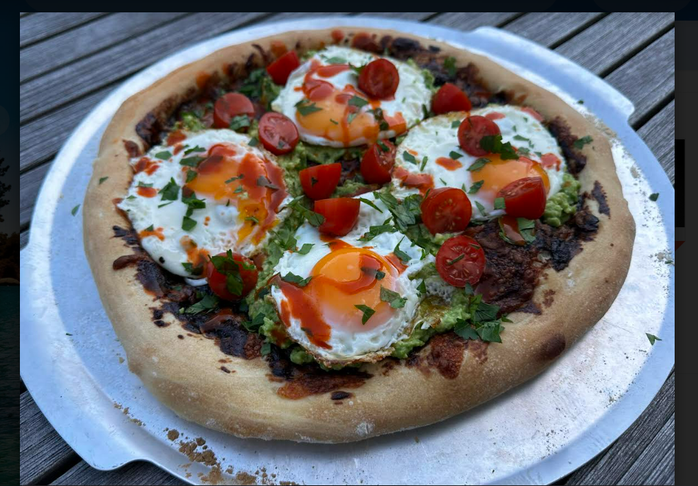 - Once your pizza is out top with the avocado, eggs, tomatoes and fresh parsley. If you are up for it drizzle a little hot sauce over the top which is a game changer!