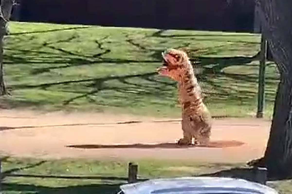 An 11-year-old boy brought a smile to faces in lockdown when he donned a dinosaur costume and cut laps of Princes Park in Parkville on Sunday.