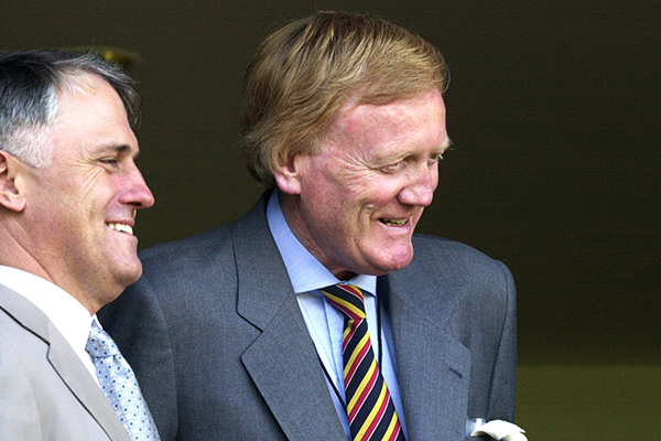Image: Ron Walker handing the reins as Liberal Party treasurer to Malcolm Turnbull in 2002 (AAP)