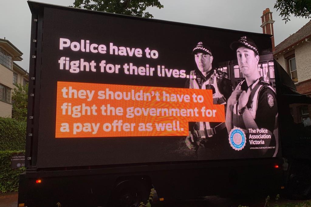 James Talia, 3AW State political reporter, confirmed a mobile billboard bemoaning the lack of progress on pay negotiations has been doing laps of the CBD this morning.