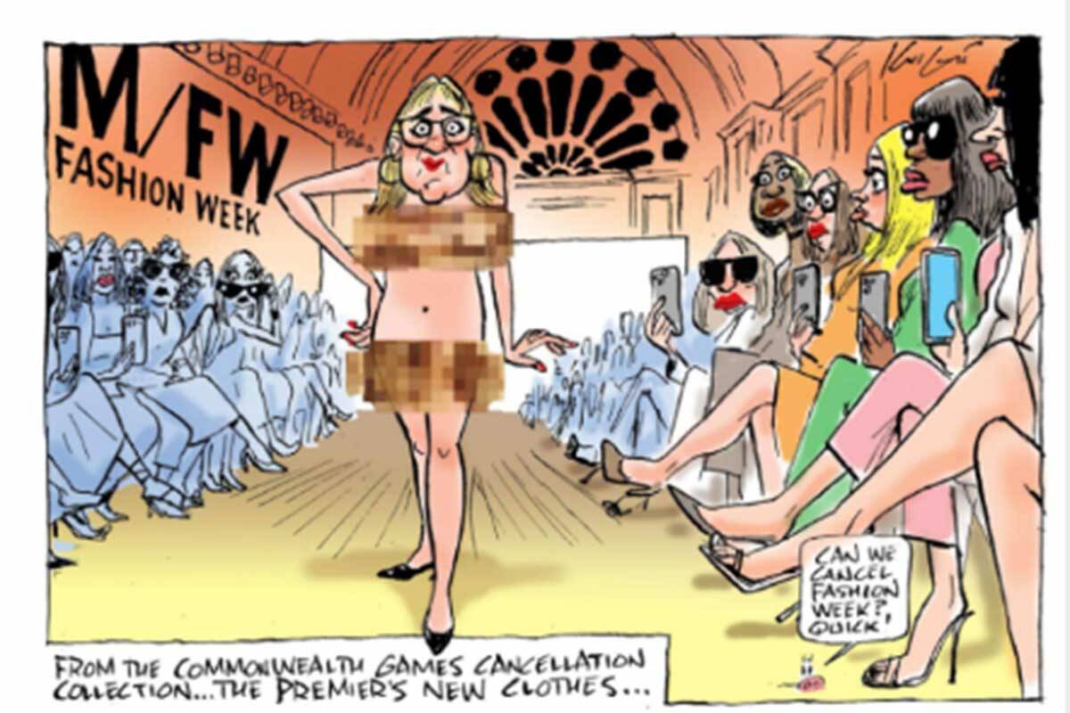 The cartoon is a play on the folktale ‘The Emperor’s New Clothes’ and includes a caption which reads “From the Commonwealth Games cancellation collection… the Premier’s new clothes…”