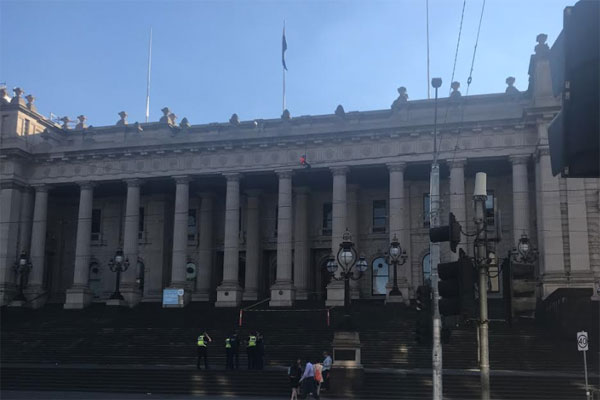 One protestor still perched on the roof of State Parliament, the three others arrested trying to join him have been released. @3AW693 pic.twitter.com/rQMVicqRQC