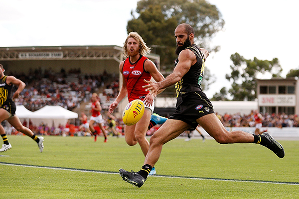 Picture: Bachar Houli gets a kick away during a pre-season match at Wangaratta in 2018 (Photo by Daniel Pockett/Getty Images)