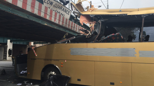 Eleven people were hospitalised when a bus slammed into the bridge on Monday.