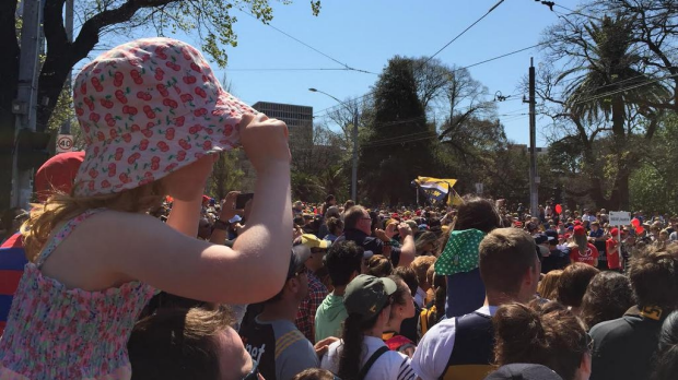 Despite a sleepy start in the city, up to 150,000 football fans took advantage of the public holiday today to attend the grand final parade, which took a different route this year, and new AFL Live Site.
