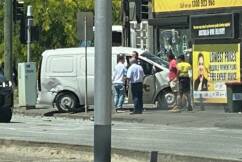 A van has crashed through the window of a cleaning store on the corner of York Street and Kings Way. Caller Andrea told Tony Moclair there’s a “bit of a traffic jam heading into the city”. Press PLAY to hear her call to 3AW on the crash Image: Supplied