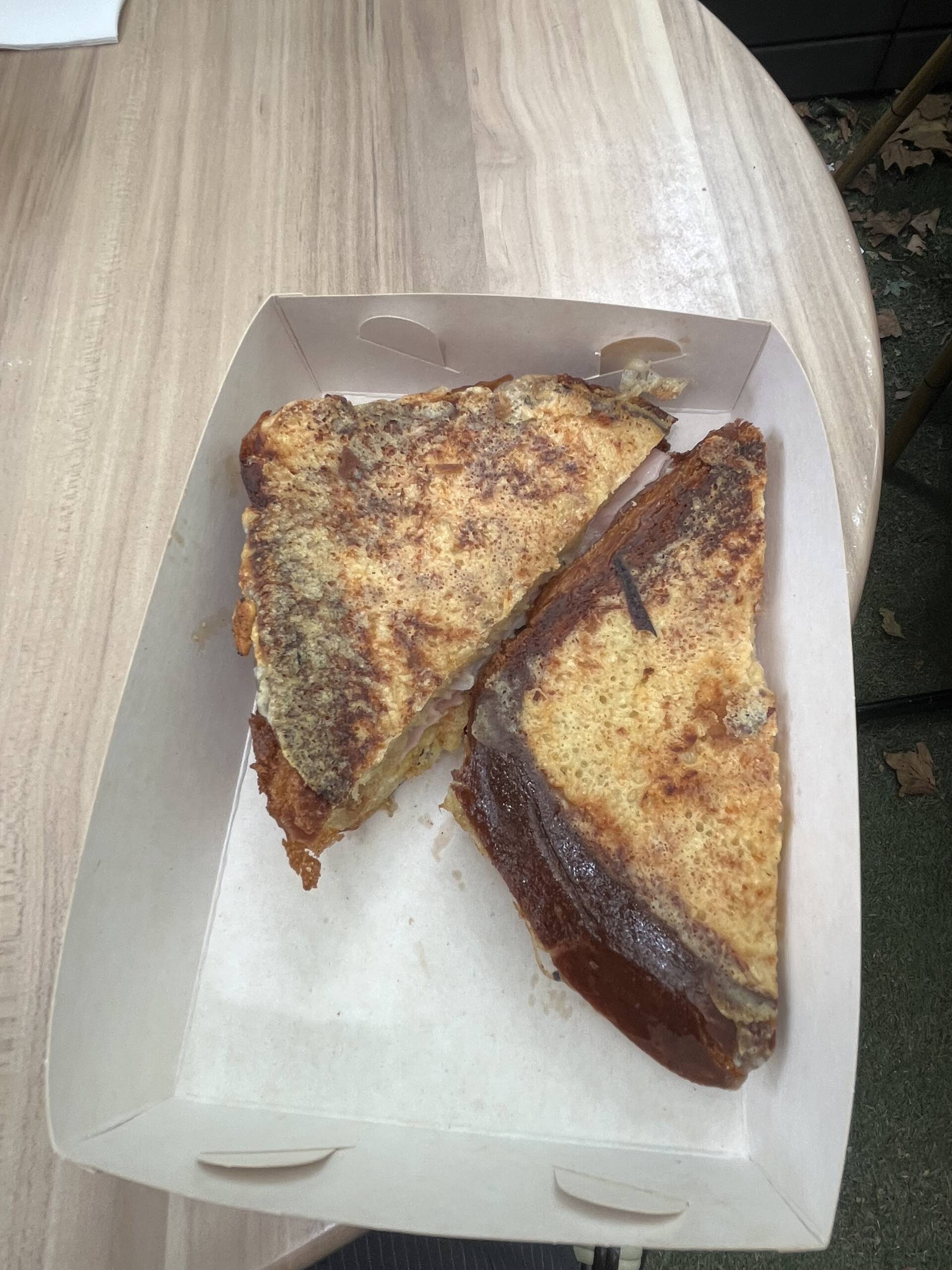 The sharpness of the pickles and Dijon cuts through the richness of the butter and cheese, the ham is properly savoury, and the whole thing tastes like something you’d grab from a corner boulangerie after accidentally walking 15 km around Paris in one day.