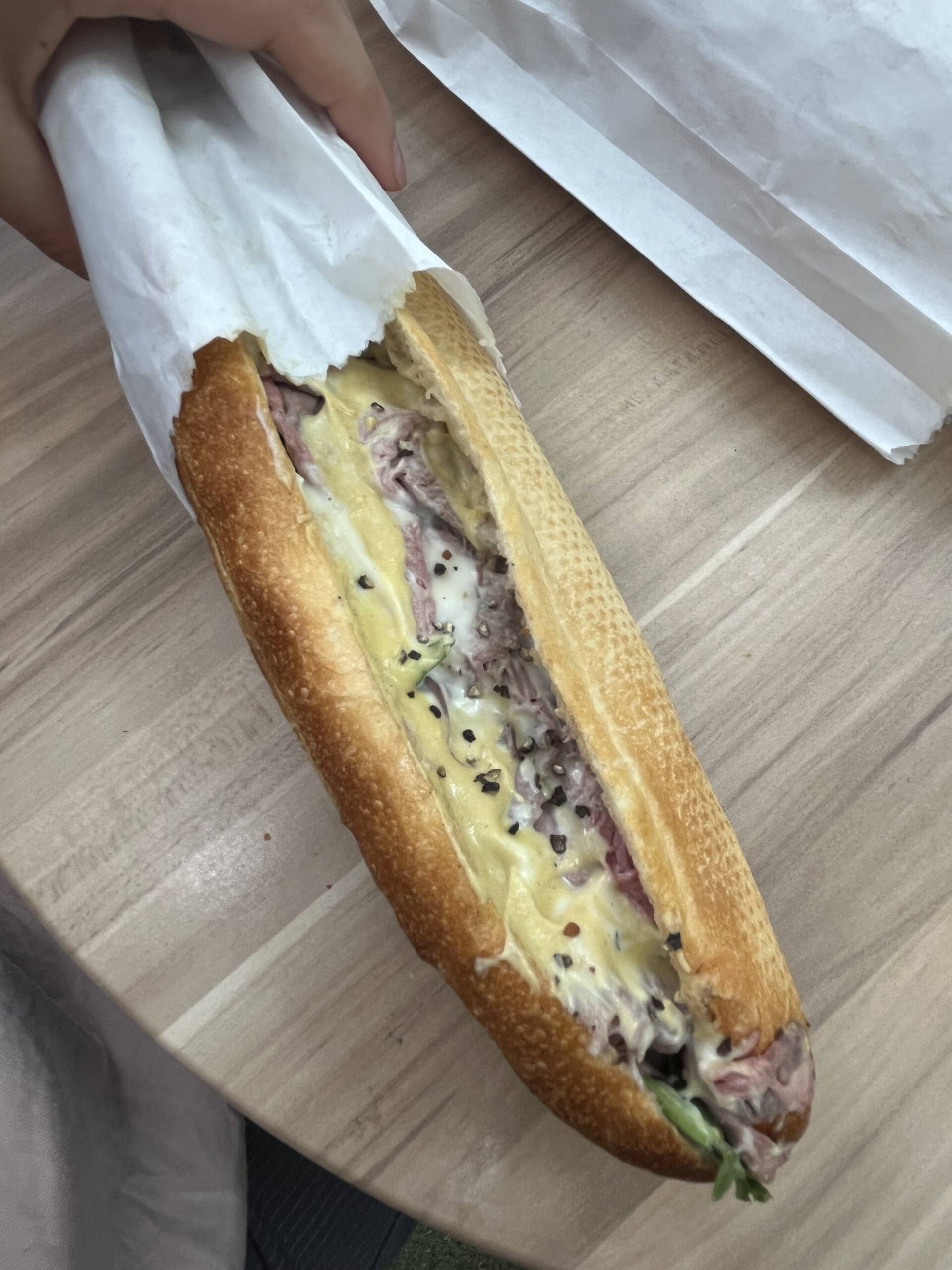 The baguette has that crucial contrast, crackly crust with a chewy interior, and the fillings run all the way to the end, no tragic two-bite dead zones.
