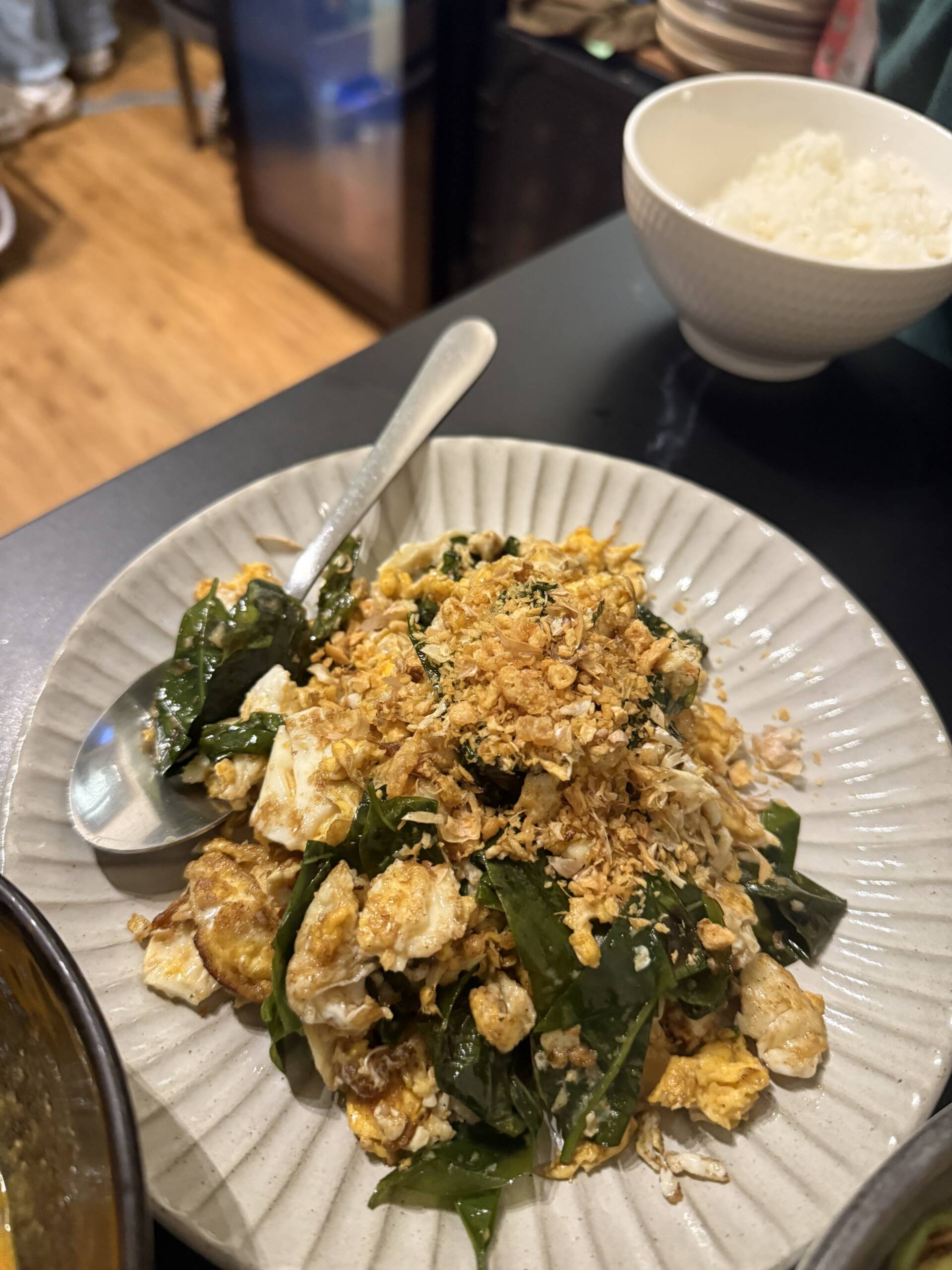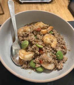 We started with the seafood spring rolls, which were crisp and clean and exactly the sort of thing you want to ease in with. But the dishes that really made the meal were the ones that gave you a sense of southern Thailand directly, especially the Bai-Leng Pad Kai and the stink bean dish, or sator. Bai leng is one of those ingredients most people probably won’t know unless they’ve spent time eating regional Thai food. It’s a leafy green used a lot in southern Thai cooking and stir-fried with egg and garlic, surprisingly delicious. I love a dish that presents an ingredient I’ve never had.