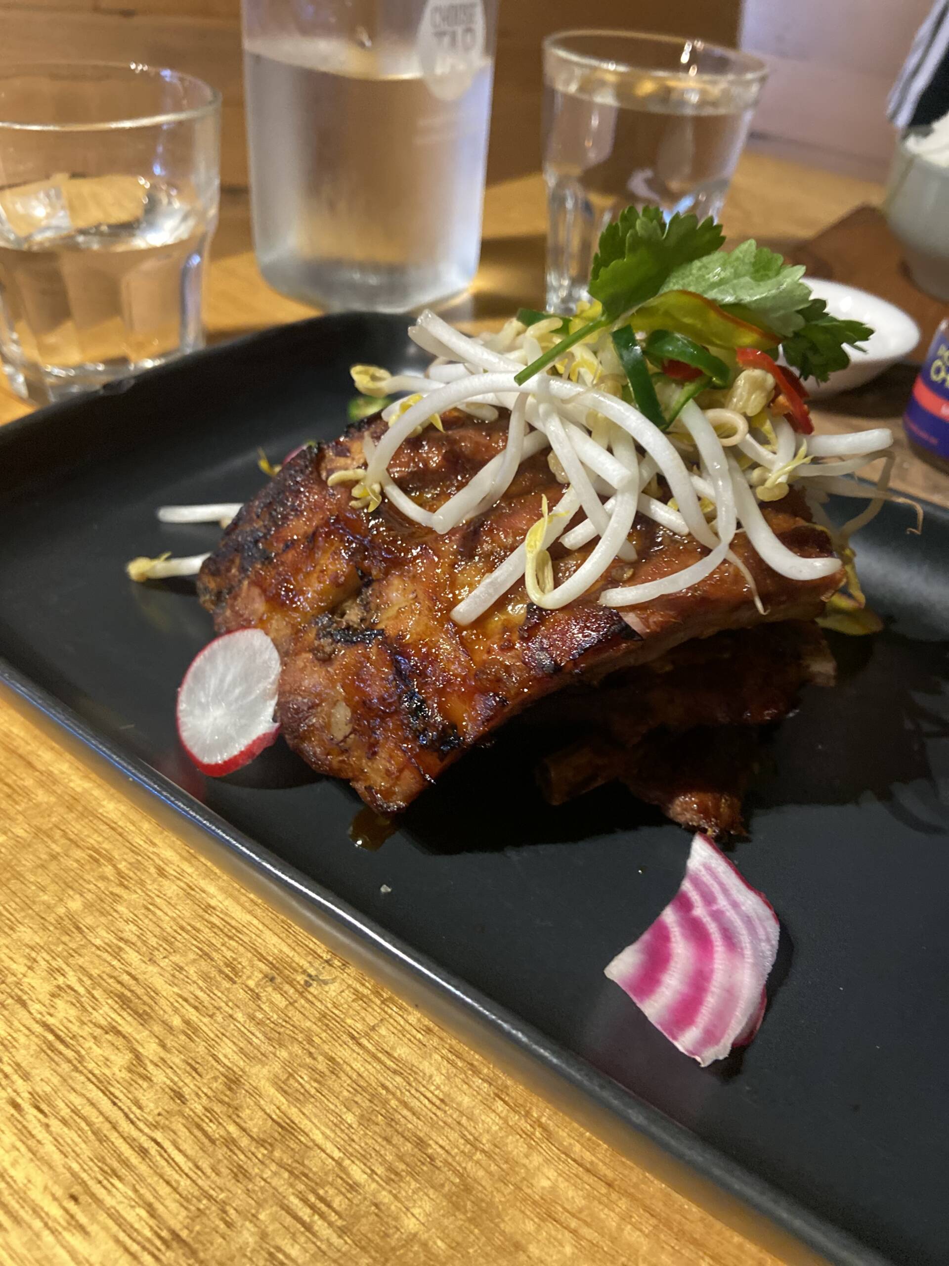 Next, we tried the half-serve of pork ribs that arrived in two towers ready to fall off the bone, lacquered in a glossy, deeply caramelised sauce that clings to the meat.