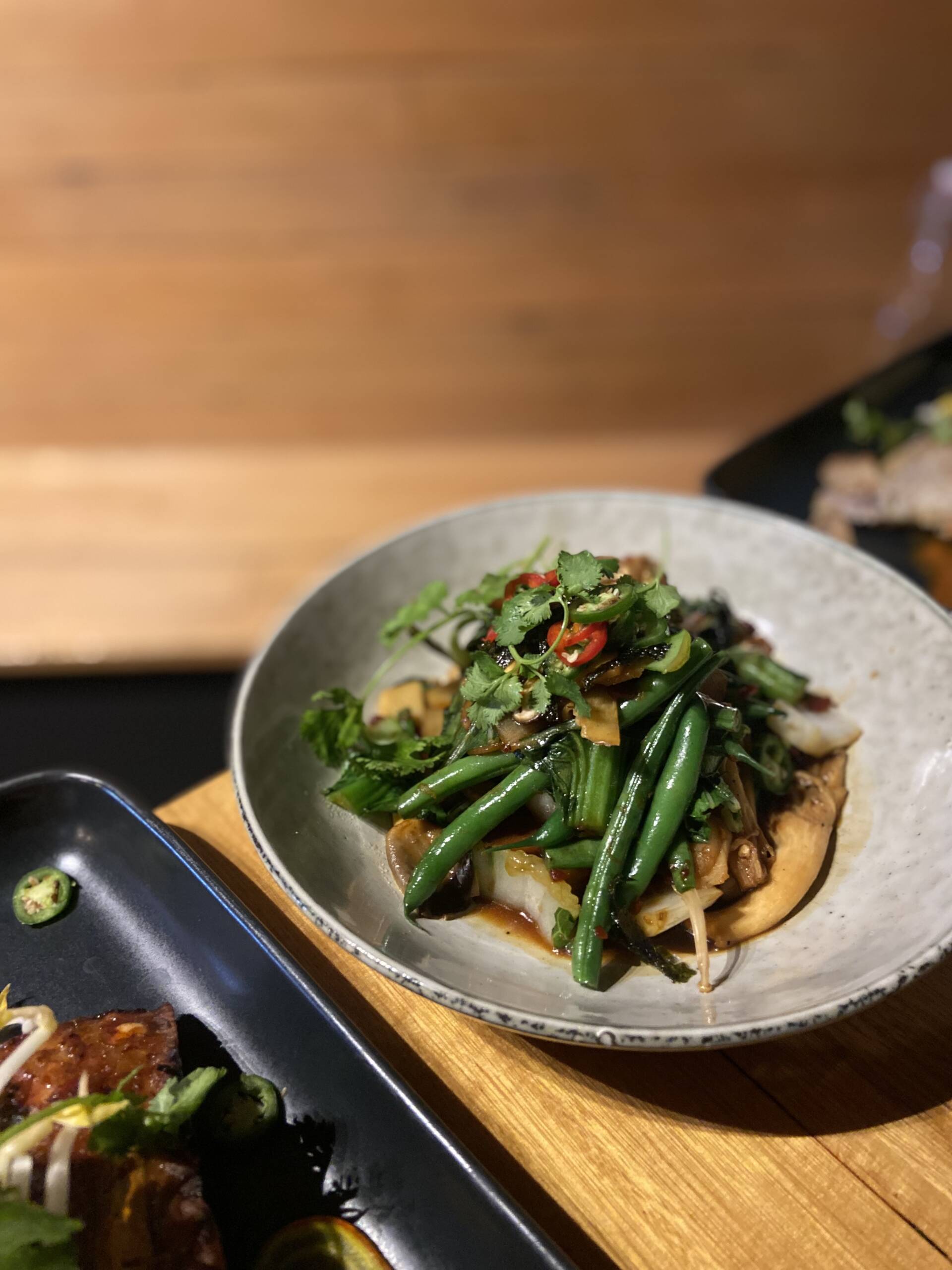 The Asian greens are the quiet achiever of the meal, wok-tossed, they hold onto their snap, with a savoury, garlicky slick of sauce that pools just enough at the base of the plate.
