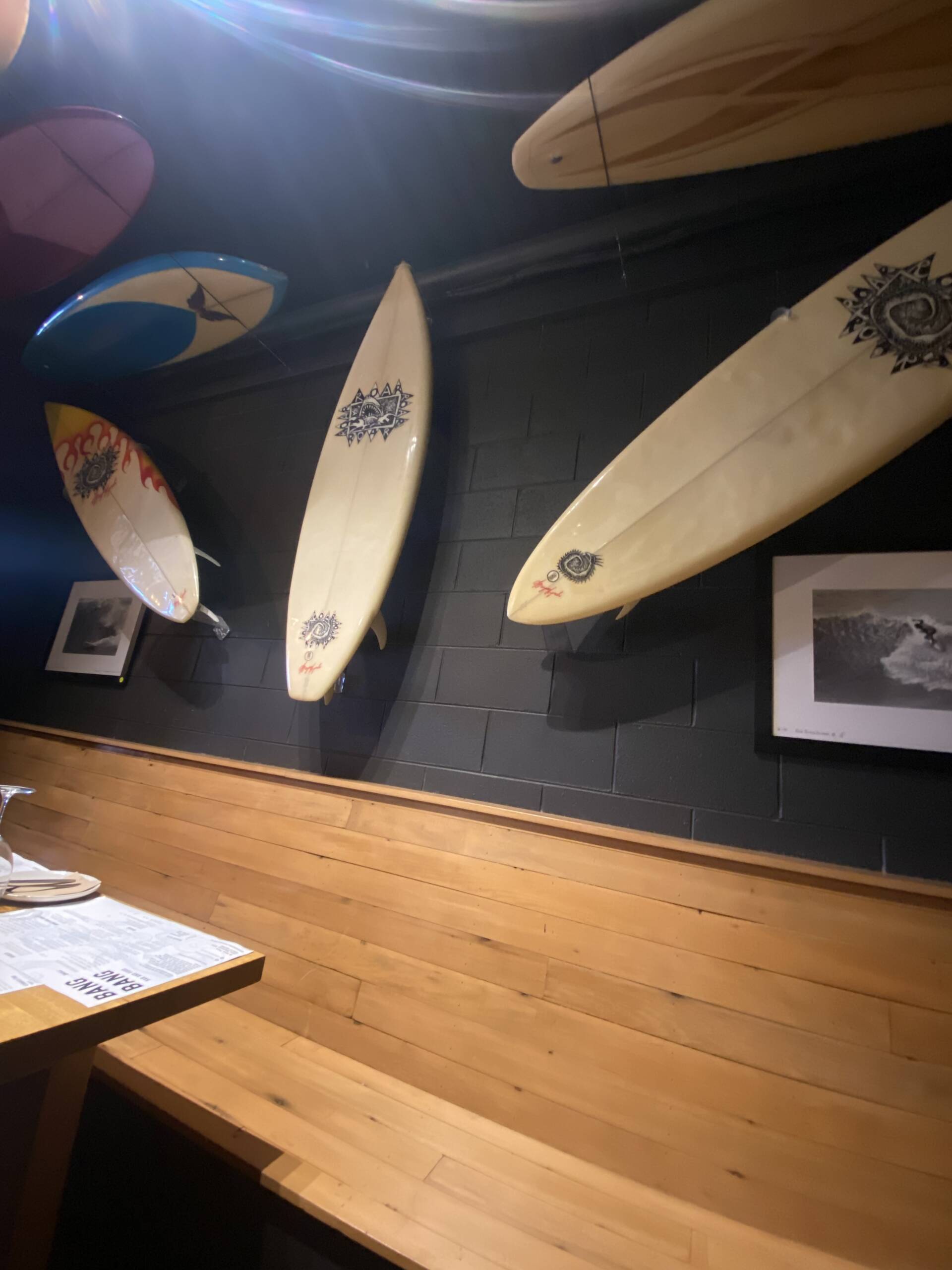 The boards span different eras and styles, and while each has its own backstory in the local surf scene, not every board’s individual owner or exact timeline is documented in detail for diners, which actually adds to the sense that you’re eating under a living, evolving piece of community history.