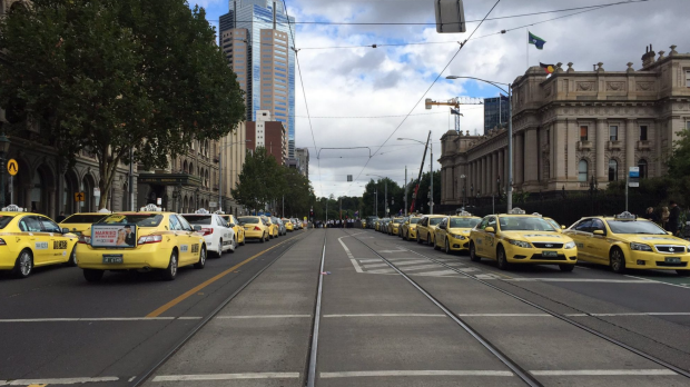 Earlier on Monday, traffic was sent into chaos with protesting taxi drivers driving at snail-pace down the Bolte Bridge.