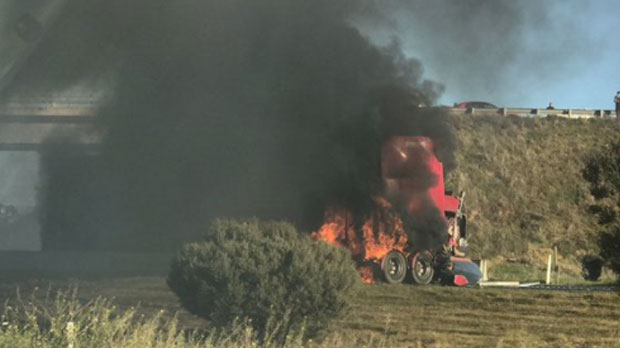 ‘Like a bomb going off’: Truck in flames after shocking smash