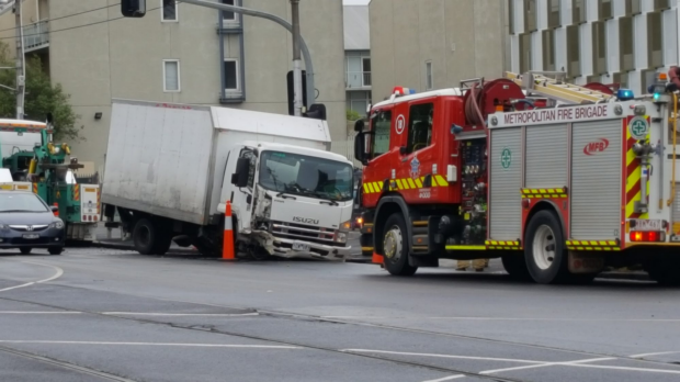 A delivery truck has lost its front wheels and axle on Lygon Street.