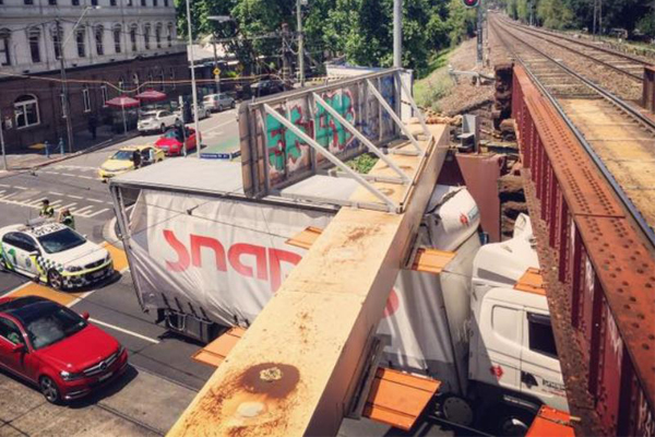 A truck has smashed into the Newmarket rail bridge in Flemington, causing traffic and tram delays in Melbourne’s north.
