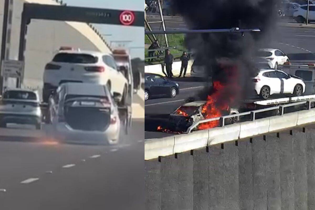 Unbelievable scenes on the M80 Ring Road as car hanging off tow truck catches fire