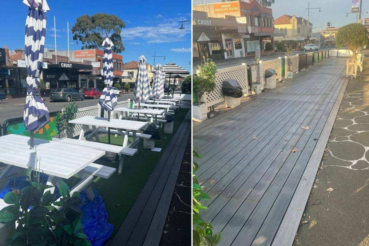 A number of businesses who share outdoor space on Upper Heidelberg Road in Ivanhoe have been left devastated after a big truck stole $15k worth of umbrellas, chairs and grass on their strip at 1am this morning.