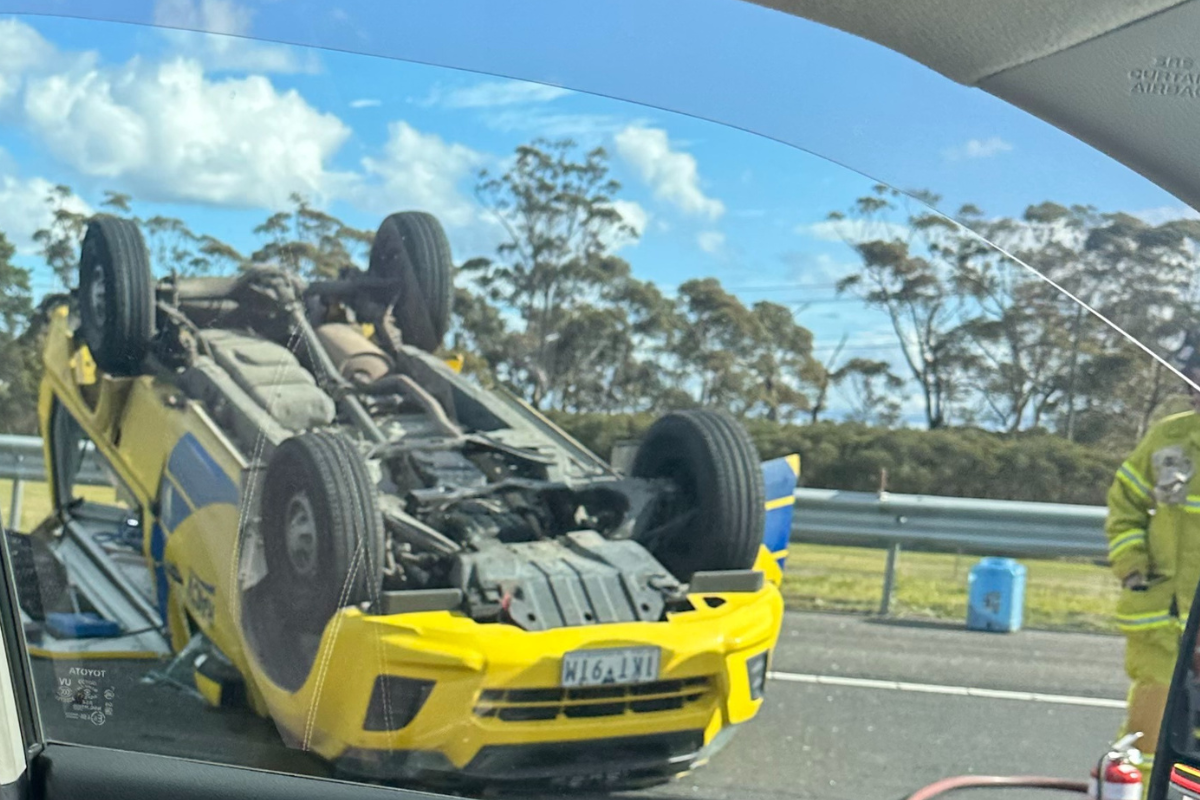 Upside down RACV car blocks traffic on the Mornington Peninsula Freeway