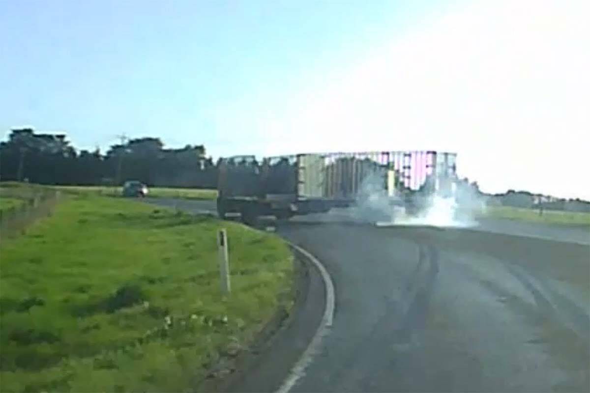 Dash cam footage shows a truck towing a trailer fishtailing on Hopkins Highway, with the trailer veering onto the wrong side of the road and almost colliding with an oncoming car at about 9.15am.