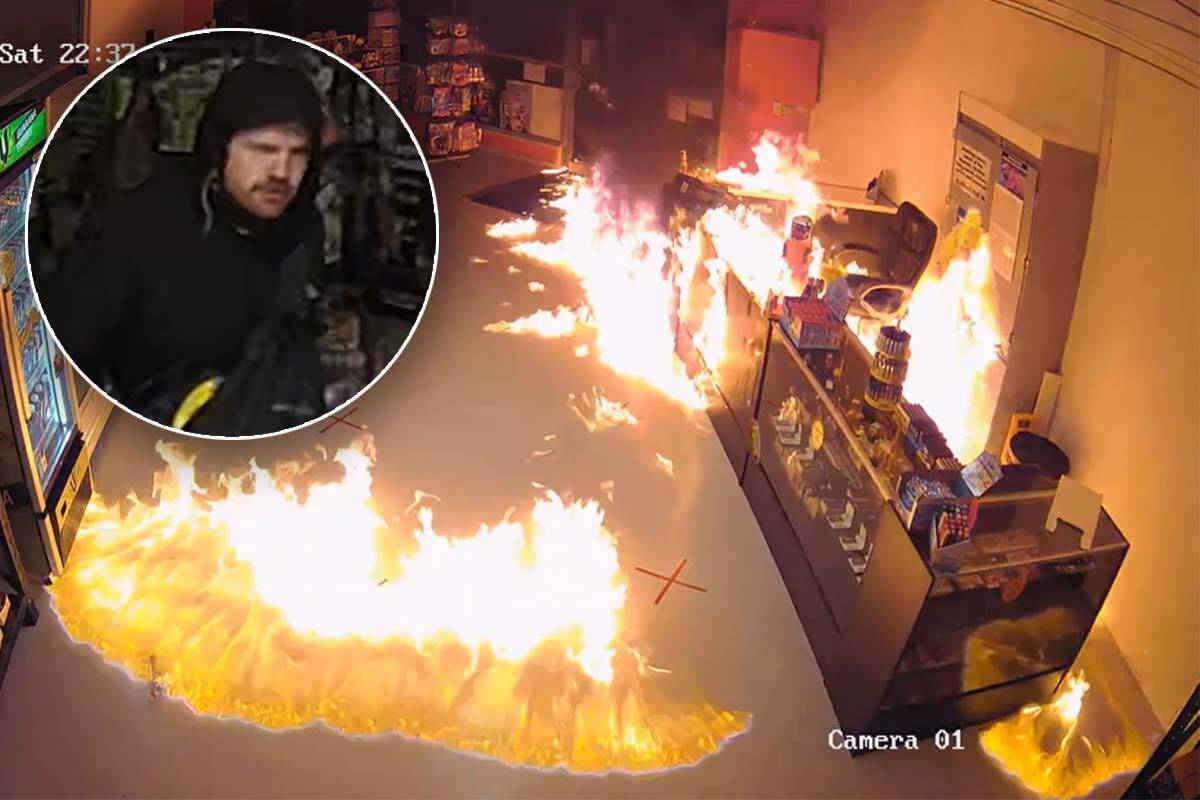 Footage shows the man smashing into the store via the front door, before pouring accelerant all over the shop.