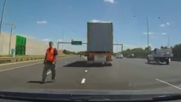 WATCH: Dash-cam captures man nearly being hit by truck on Princes Freeway