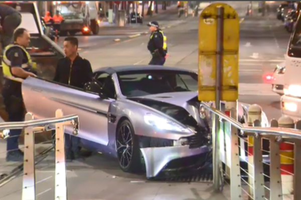 Woman runs after smashing luxury Aston Martin into CBD bollard